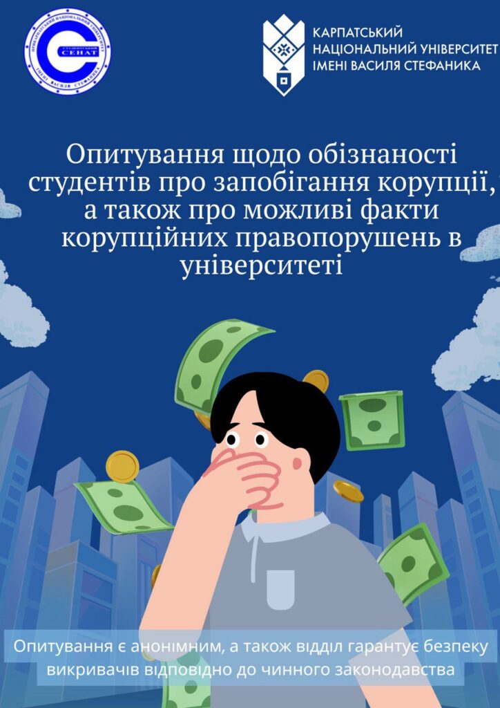 Відділ з питань запобігання та виявлення корупції Карпатського національного університету імені Василя Стефаника проводить анонімне опитування серед студентів. Його мета – оцінити рівень обізнаності здобувачів освіти щодо антикорупційної політики університету, з’ясувати, наскільки відомими є діючі механізми запобігання і протидії корупції, Читати далі